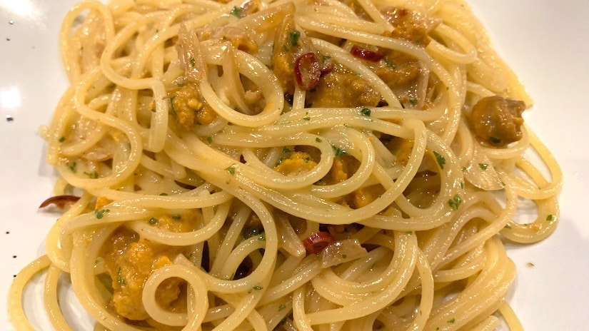 バターで炒めた「ウニ」を、にんにくの香り高いペペロンチーノと合わせました。