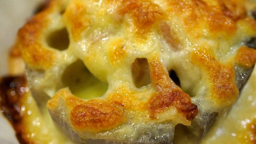 Thickly sliced "Renkon" is served with cheese sauce with bacon and cheese for gratin.
