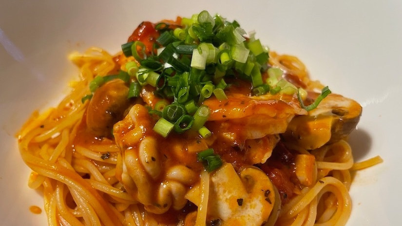殻から出汁を取ったスープをパスタに吸わせて仕上げます。